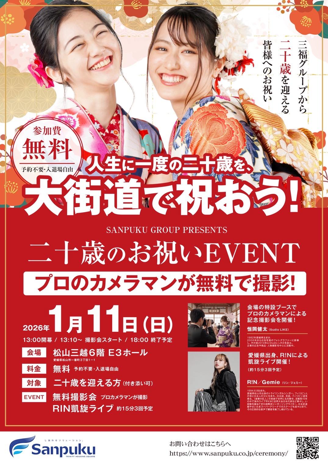 SANPUKU GROUP PRESENTS「二十歳のお祝いEVENT」@松山三越6階 E3ホールプロのカメラマンによる無料撮影会もあります!詳しくは画像をご覧ください。地元愛媛の成人イベントに関わることが出来て嬉しいです。新成人のみなさま、是非お待ちしております!